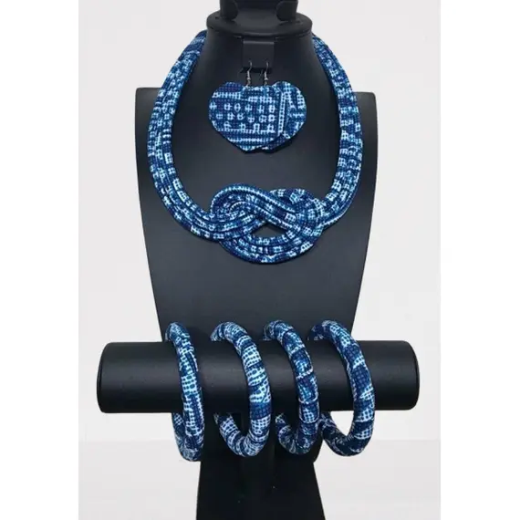 Handmade Blue Earrings, Knotted Cloth Necklace, and Chunky Bangle Bracelet Set for Women – 4-Piece Jewelry Set (2.6 Inches)