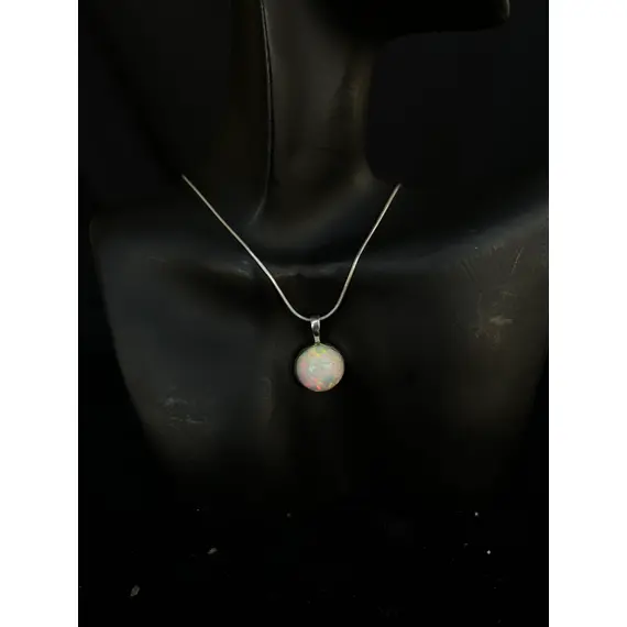 white base natural Ethiopian welo opal with excellent play of color. Wear the natural Ethiopian Opal necklace and watch compliments roll in. Eye-catching design and shimmering opal will capture the admiration of everyone you meet. Pendant dimensions- round shap